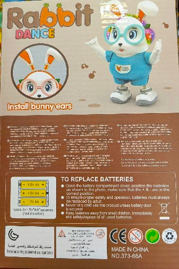 در قسمت پشت اسباب بازی جای سه باتری قلمی است که با باز کردن درب آن می توانید باتری ها را در جای خود قرار دهید. همچنین در کنار این خرگوش اسباب بازی یک دکمه آن و آف وجود دارد که با روشن کردن آن اسباب بازی روشن می شود. بعد از روشن کردن اسباب بازی، خرگوش شروع به رقصیدن می کند، موزیک پخش می نماید و چراغ های رنگی روی هدفون و گوش خرگوش روشن می شود.